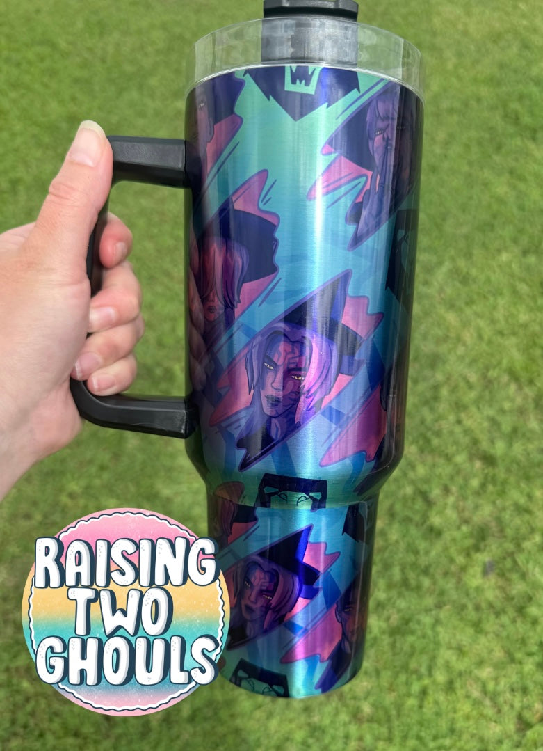 Our Demon boy band design on a 40 oz tumbler! This listing includes one tumbler with lid and reusable straw.