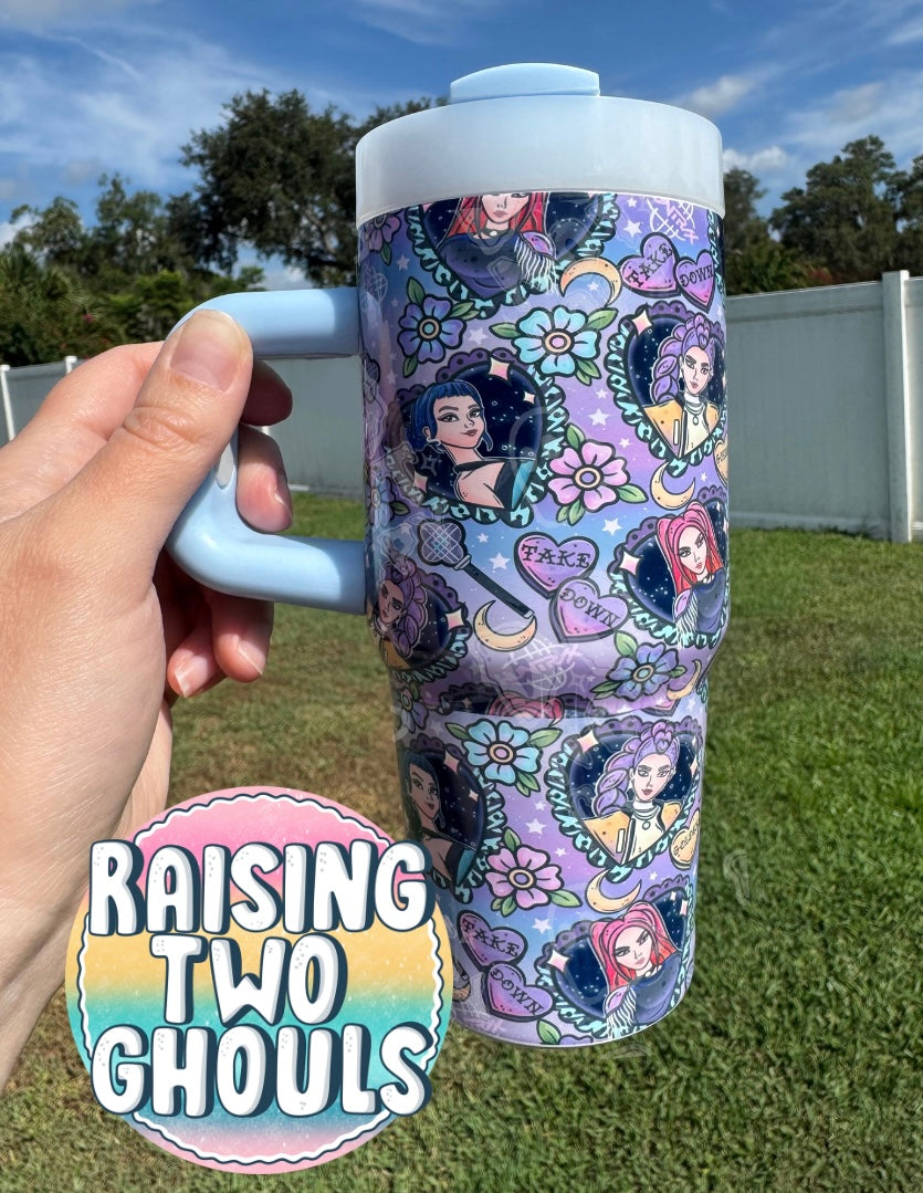 Our Huntrix Hearts inspired full wrap 14 oz tumbler! This listing includes one tumbler with lid and reusable straw.