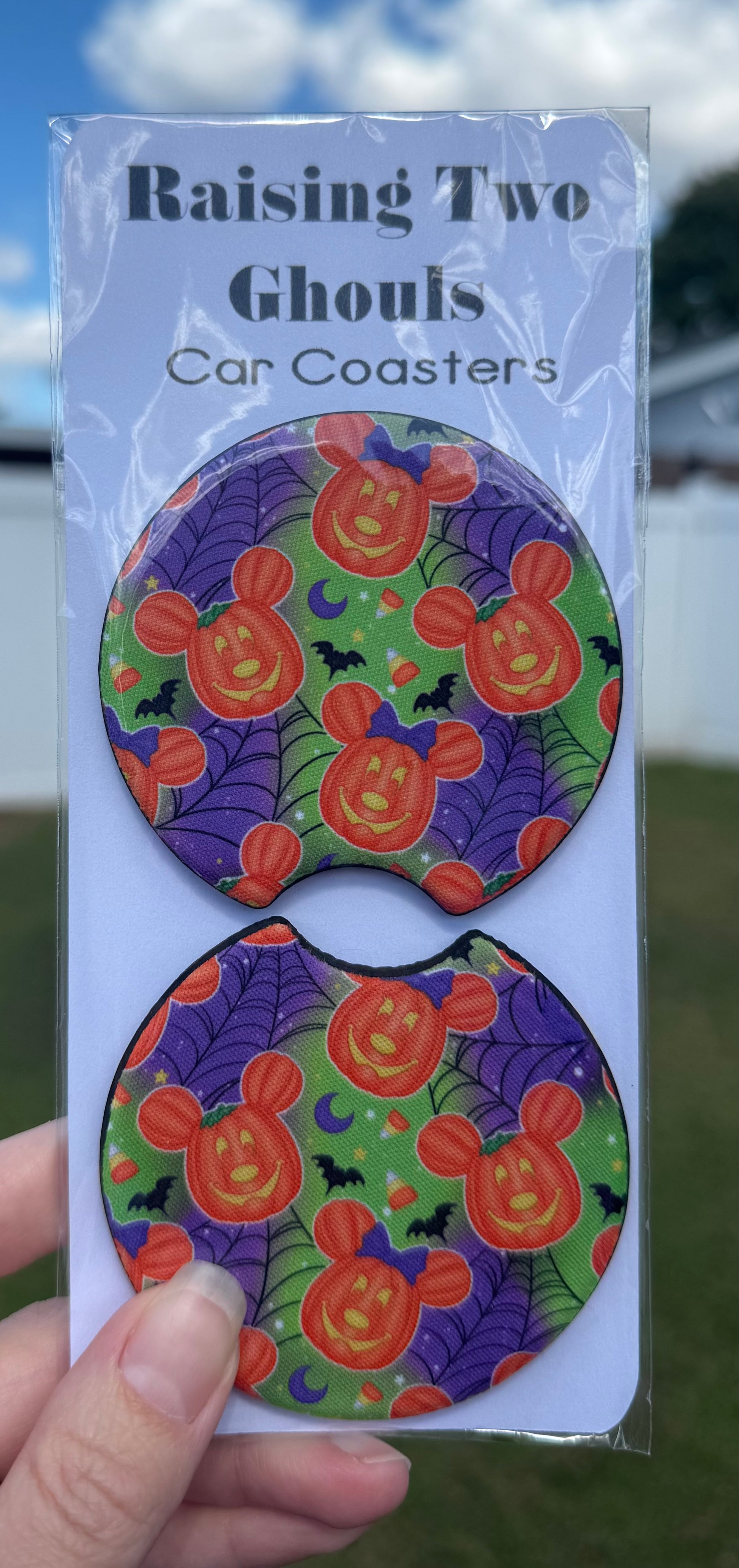 Our mouse pumpkin car coasters, make sure to check out our matching tumblers! This comes as a set of 2 and will fit most vehicle cup holders.